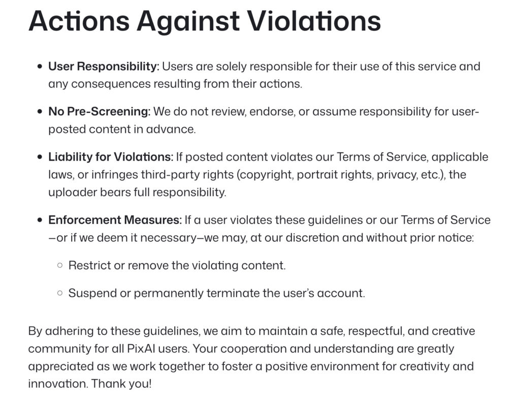 PixAIのガイドラインでは、違反が確認された場合、運営の判断により事前通知なしで対応が行われる可能性があります。