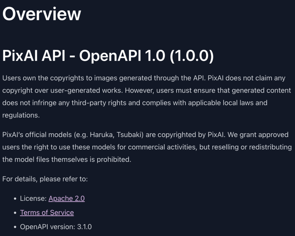 PixAI Platform DocumentationのOverviewには、公式モデルはPixAIが著作権を持ち、商用利用は認める一方で、モデルファイルの再販・再配布は禁止と明記されています。