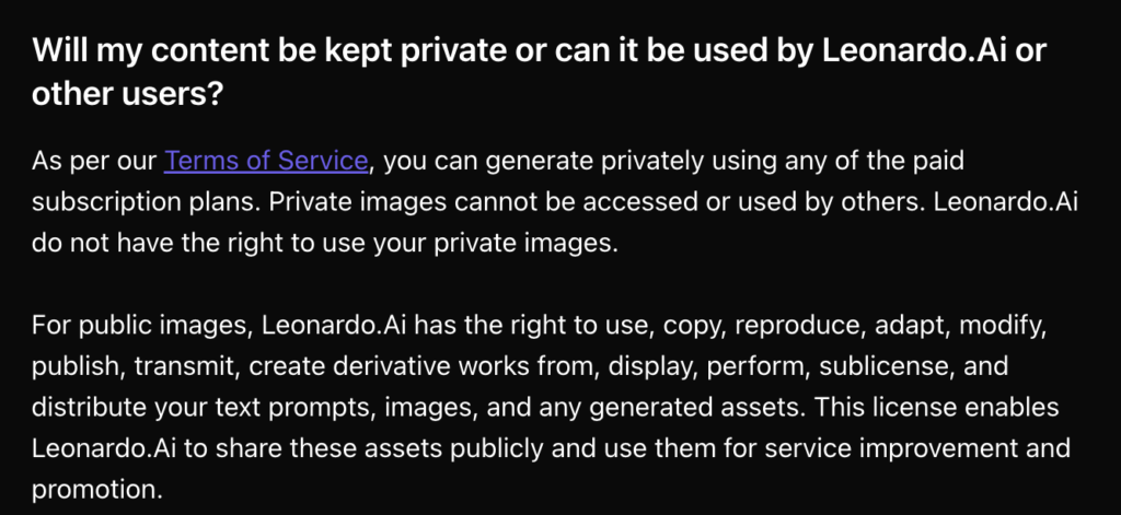 Leonardo AIのFAQ内では、Private画像についてはLeonardo AI側が利用する権利を持たない、という説明があります。