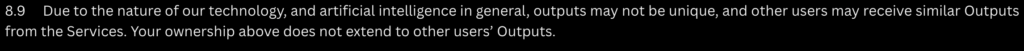 利用規約では、AIの性質上、生成されるOutputが必ずしも一意(ユニーク)であるとは保証されない旨が明記されています。