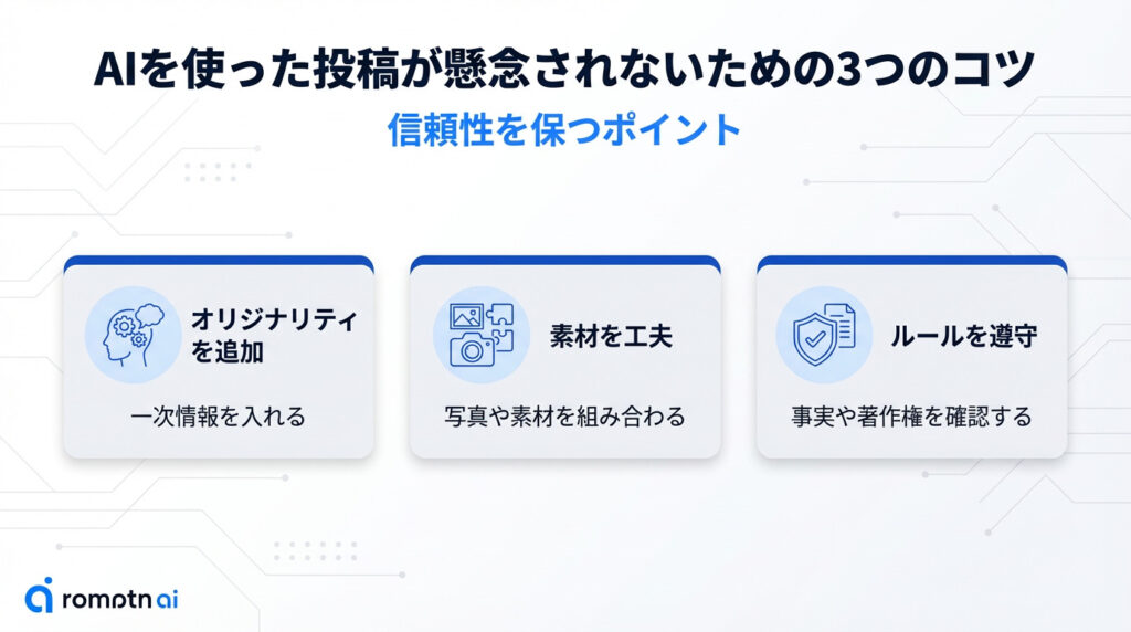 AIで作成した投稿に対して「テンプレートっぽい」「気持ち悪い」と感じるフォロワーも一定数いらっしゃいます。以下の3つのコツを押さえれば、AIを使いながらも自然で信頼感のある投稿を維持できます。