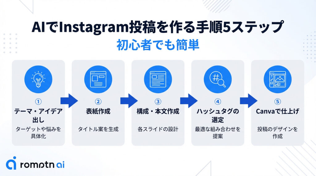 ここからは、ChatGPTとCanvaを組み合わせた実践的な手順をSTEP形式で解説します。 STEP1〜4はChatGPTを使ったテキスト作成、STEP5はCanvaを使ったビジュアル仕上げの工程です。