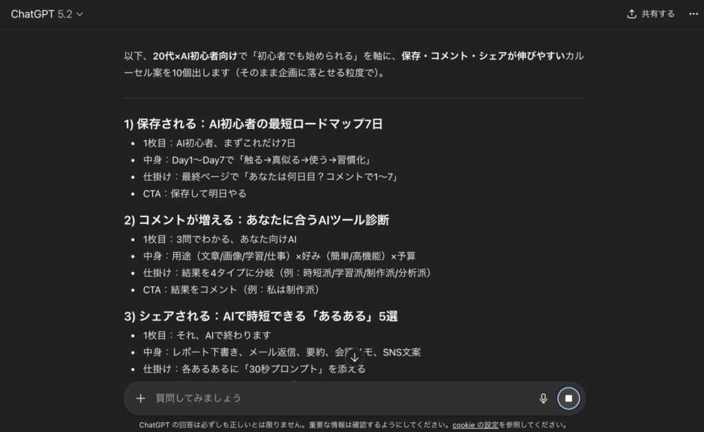 カルーセル投稿の1枚目は「続きを読みたい」と思わせるタイトルが命。AIに任せながら人間が調整することで、フォロワーの目を引くタイトル案を素早く複数得ることができます。