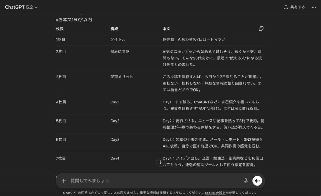 STEP1・2で決めたテーマとタイトルをChatGPTに引き継ぎ、「10枚分の構成と本文(各150字以内)を表形式で出力して」と指示すれば、そのままCanvaに貼り付けられる形式でテキストが完成します。