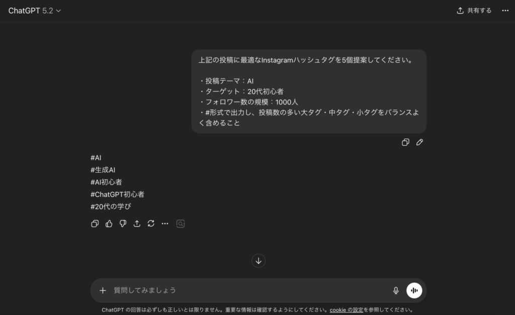 投稿の内容や規模に合わせて大中小のタグを混在させることが基本。 ChatGPTに「テーマ・ターゲット・フォロワー規模」を伝えて「#形式で5個出力して」と指示するだけで候補が一覧で得られますよ。