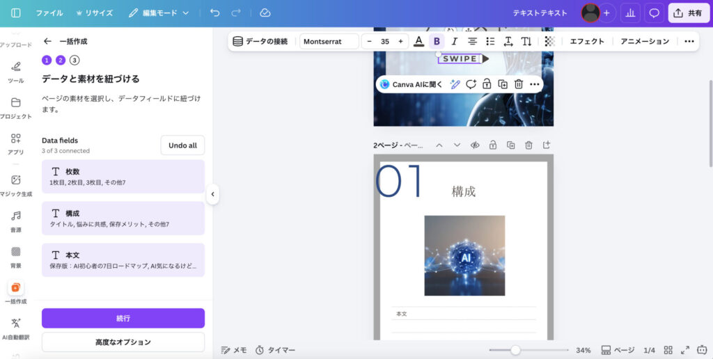 STEP1〜4で作成したテキストをCanvaの「一括作成」機能に取り込めば、カルーセル全スライドのデザインを数分で自動生成できます。手順は以下のとおりです。