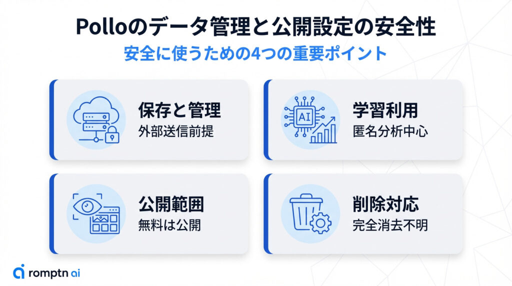 Polloを安全に使ううえで最も重要なのが、データの扱いと公開設定です。ここを理解せずに使うと、意図しない情報公開やリスクにつながります。仕組みを具体的に整理します。