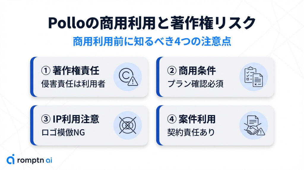 Polloをビジネスや副業で使う場合、重要になるのが著作権と商用利用の条件です。ここでは、Polloを商用利用する際に押さえるべき具体的なポイントを整理します。