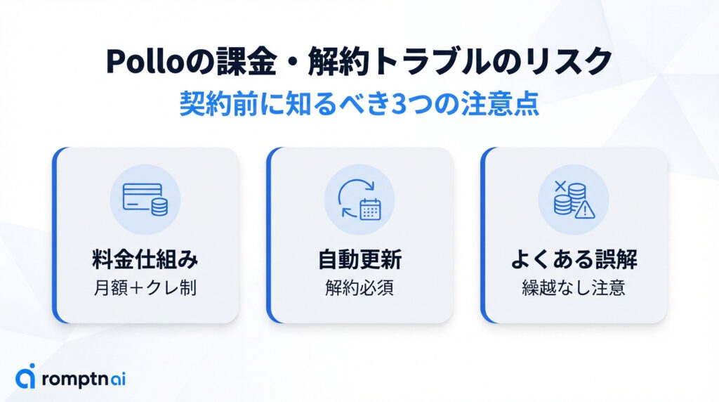 Polloを有料プランで利用する場合、技術的な安全性とは別に「支払いまわりのリスク」を理解しておく必要があります。ここでは、課金と解約に関する具体的な注意点を整理します。
