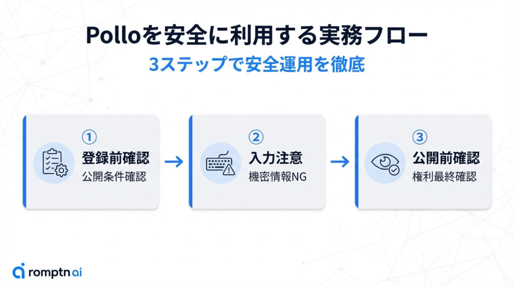 ただし、Pollo側がサービス改善目的で統計的に使う可能性はあります。この点を踏まえ、個人情報や機密情報は入力しない運用が安全です。