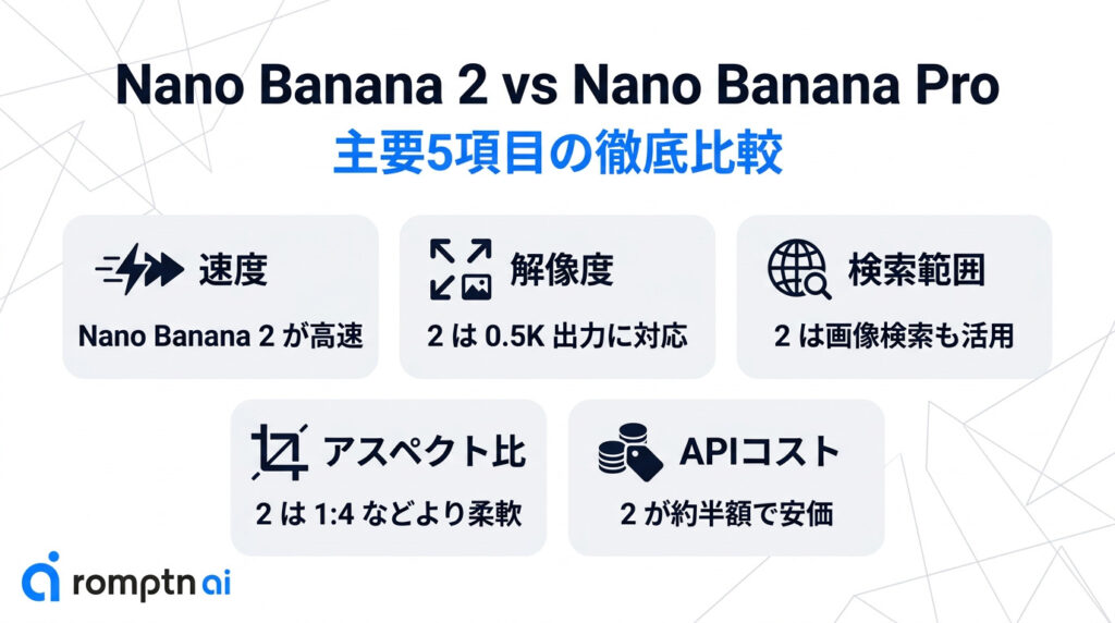 ここでは「Nano Banana 2」と「Nano Banana Pro」の違いについて、特に違いの見られる5項目の比較で解説します。