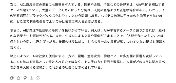 また、プロンプトを工夫しても、生成された文章をそのまま使うのは避けましょう。あくまで「たたき台」として活用し、最終的には自分の言葉で手を加えることが重要です。
