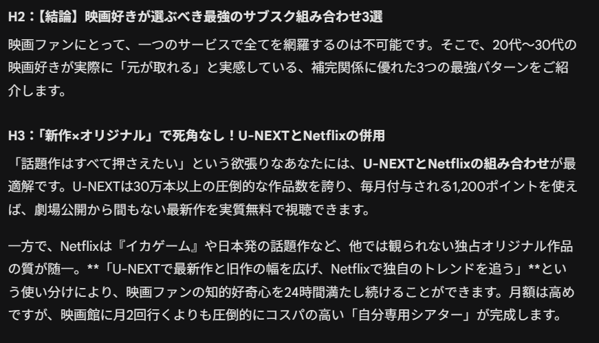 H2:【結論】映画好きが選ぶべき最強のサブスク組み合わせ3選 このセクションの本文を各h3 300字程度で書いて。