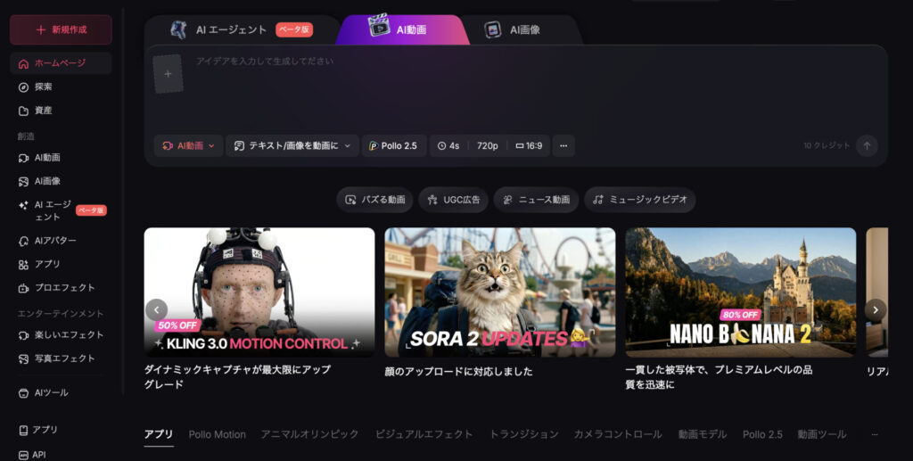 また、Pollo AIはテンプレートやアプリ形式の機能も用意されており、プロンプトを入力するだけで動画を生成できる点も使いやすいポイントです。AI動画生成を初めて試す人でも操作しやすい設計になっています。