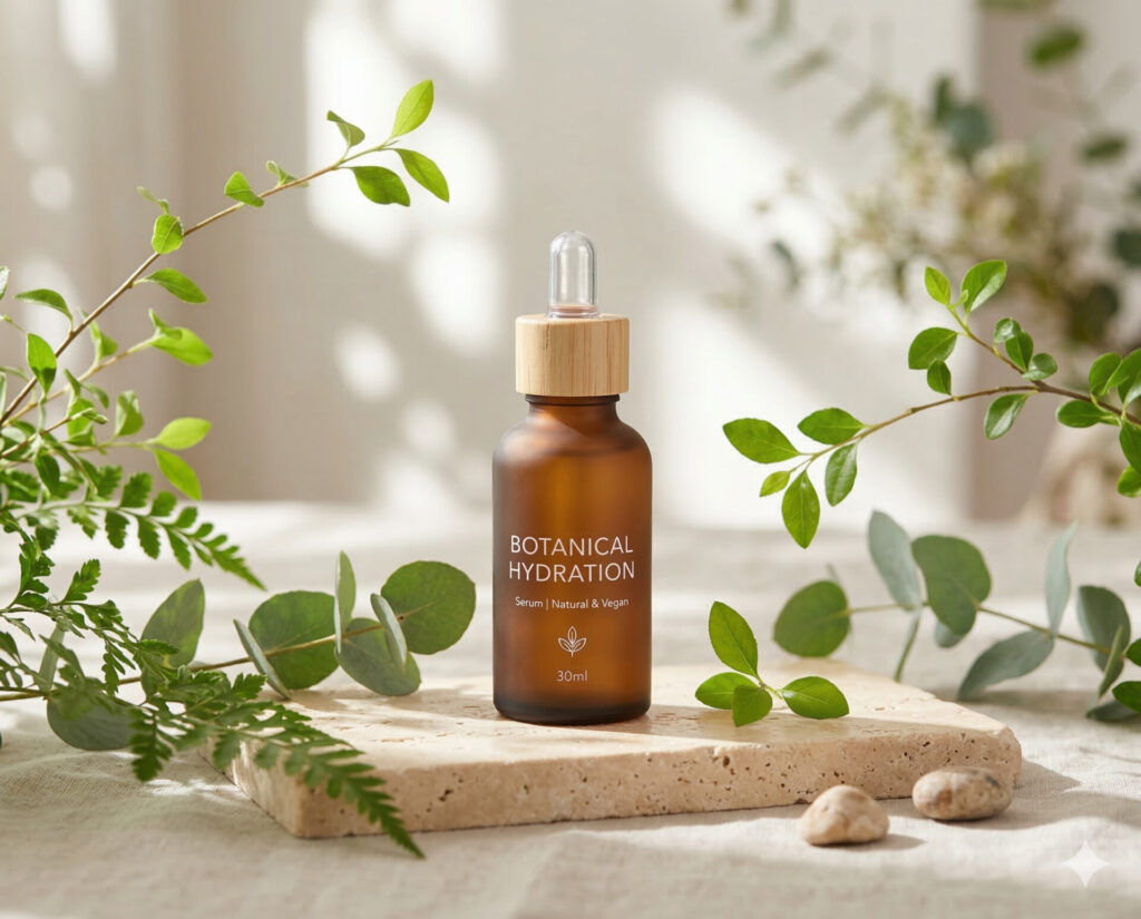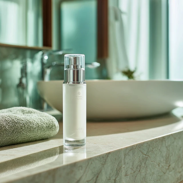 コスメECでは、商品ボトルやパッケージ画像から世界観のある広告用画像を量産しやすいです。水滴、洗面台、大理石、植物、光の演出などを加えるだけでも、ブランドイメージを強化しやすくなります。