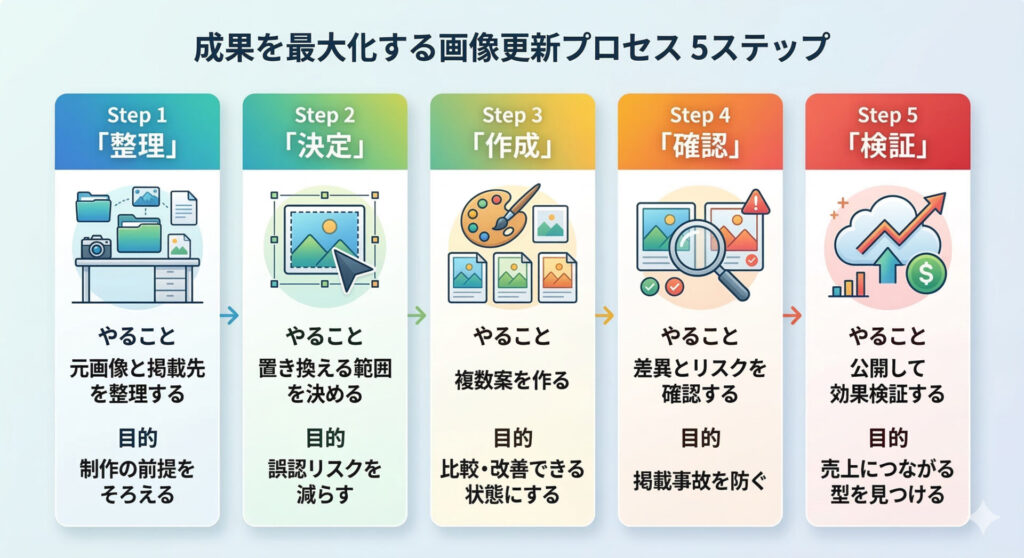 特にECでは「見栄え」だけでなく「誤認のなさ」や「成果の出しやすさ」も重要なので、以下の5ステップで進めるのがおすすめです。