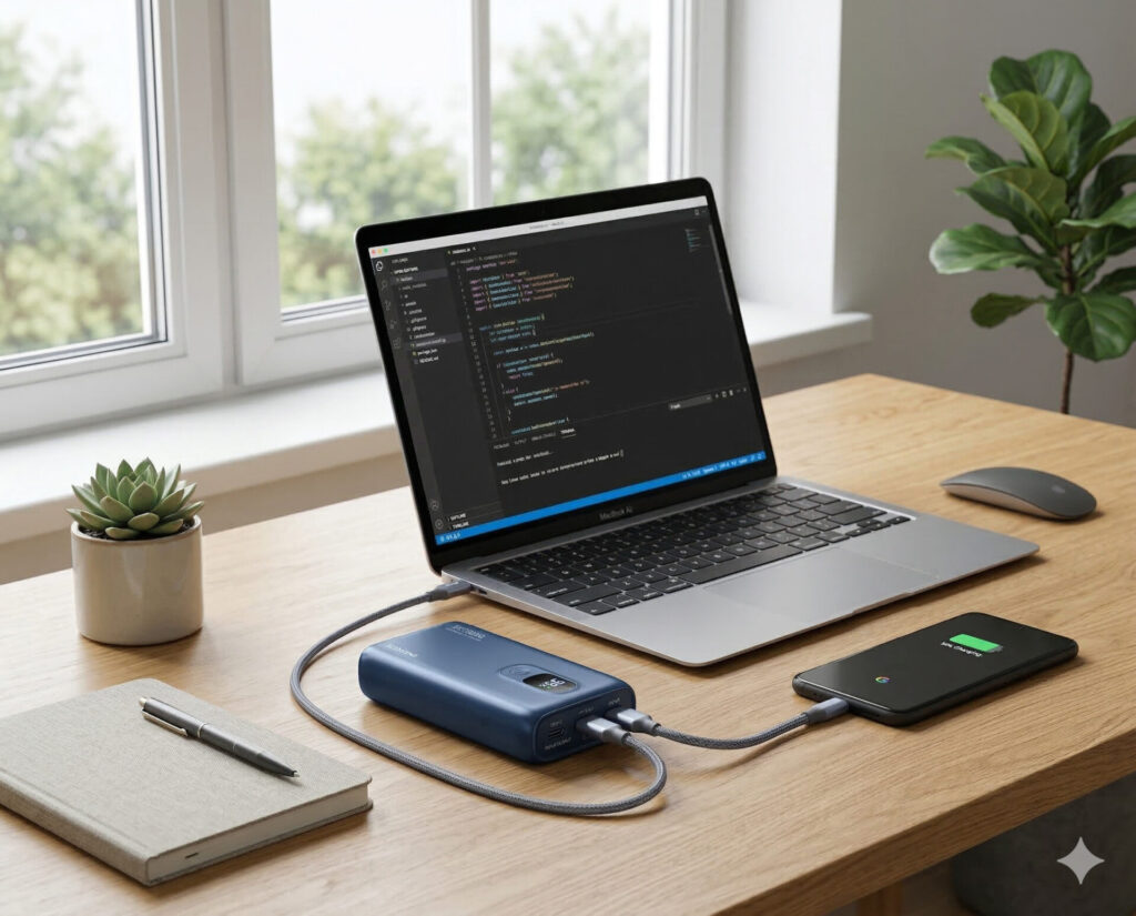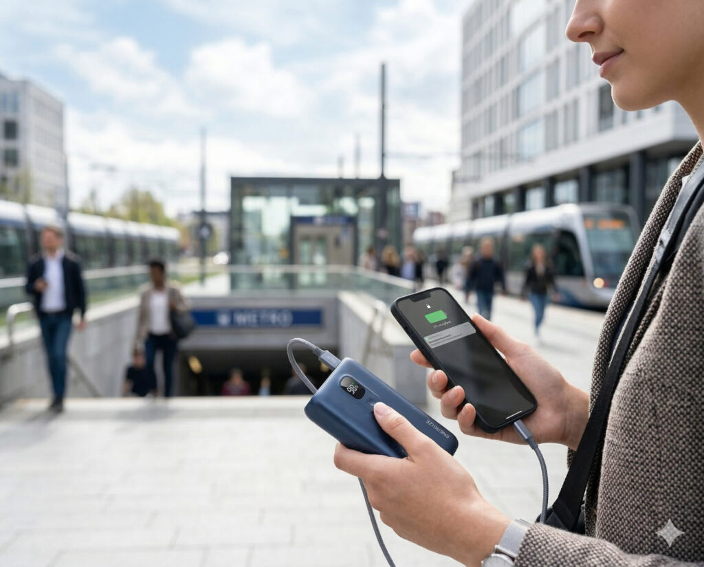 - モバイルバッテリーを通勤・旅行シーンで見せる