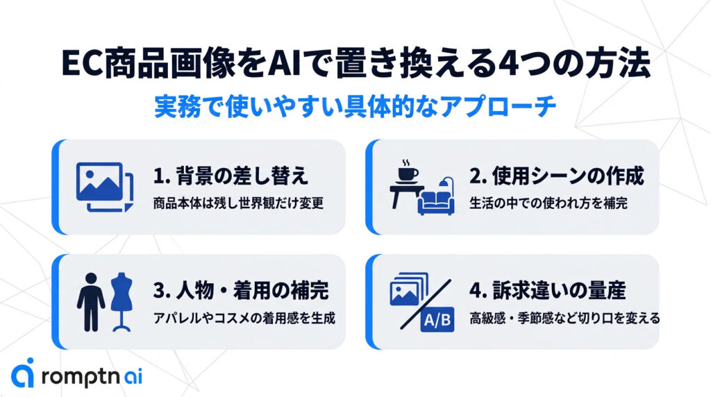 ECサイトの商品画像をAIで置き換える方法はいくつかありますが、重要なのは「どのツールを使うか」よりも、何をどう置き換えるかを先に決めることです。ここでは、実務で使いやすい4つの方法に分けて解説します。