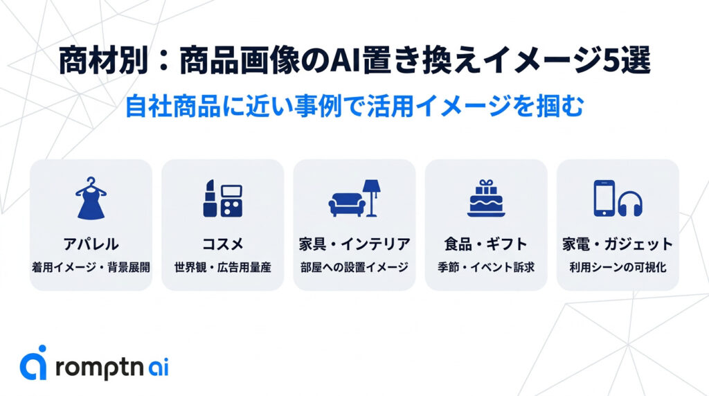 アパレル、コスメ、家具、食品、家電など商材ごとにAI画像の活用パターンを変えると導入イメージを具体化しやすい