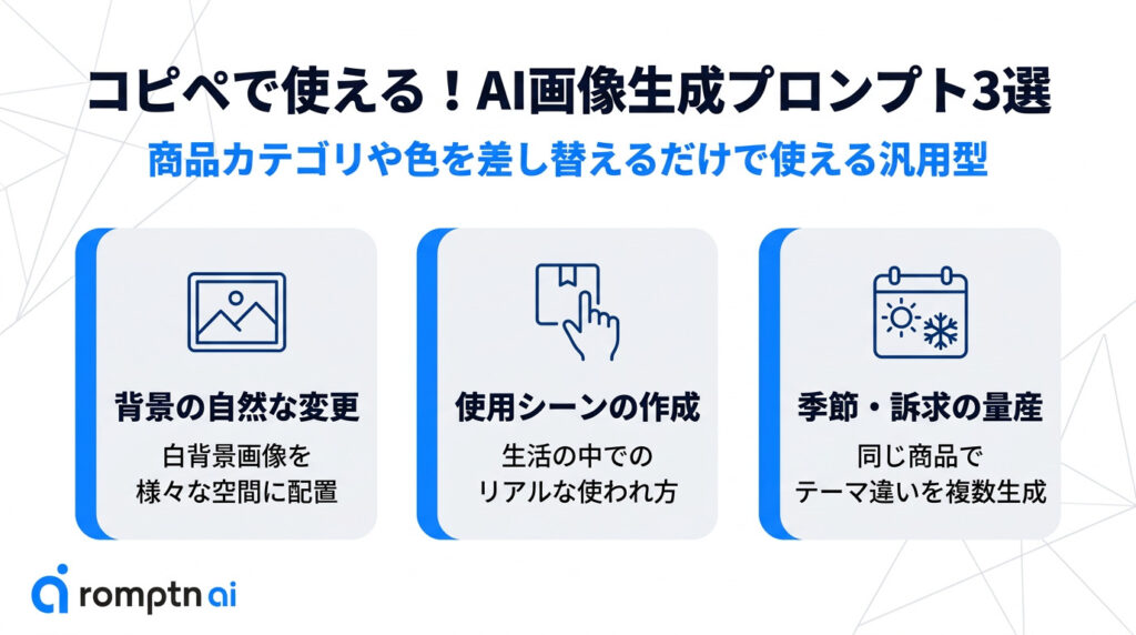 ここからは、実際に商品画像のAI置き換えで使いやすい汎用プロンプトを3つ紹介します。どれも特定の商品名に依存しない形にしているので、商品カテゴリ、色、素材、掲載先を差し替えるだけで使い回しやすいです。