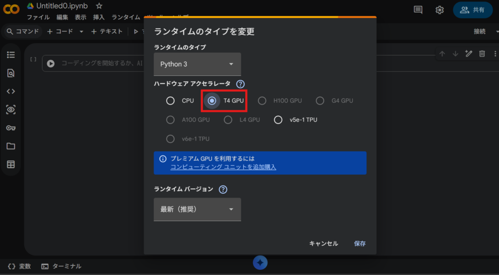 Googleドライブを開き、「新規」>「その他」>「Google Colaboratory」を選択して新しいノートブックを作成します。上部メニューの「ランタイム」>「ランタイムのタイプを変更」から、ハードウェアアクセラレータを「T4 GPU」(または利用可能なGPU)に設定して保存します。