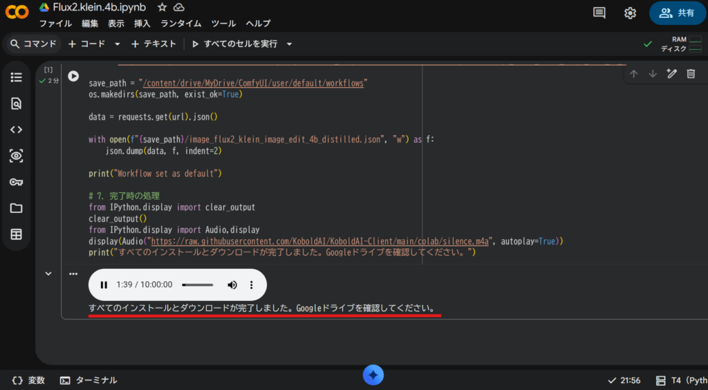 #@title Install ComfyUI and Download Model # 1. Googleドライブをマウント from google.colab import drive drive.mount('/content/drive') # 2. 必要なツールのインストール !apt -q install -y aria2 # 3. Googleドライブ内に移動してComfyUIをインストール %cd /content/drive/MyDrive/ !git clone https://github.com/comfyanonymous/ComfyUI || true %cd /content/drive/MyDrive/ComfyUI !pip -q install -r requirements.txt # 4. ComfyUI-Managerのインストール %cd /content/drive/MyDrive/ComfyUI/custom_nodes !git clone https://github.com/ltdrdata/ComfyUI-Manager.git || true %cd /content/drive/MyDrive/ComfyUI/custom_nodes/ComfyUI-Manager # 5. モデルのダウンロード # Qwenのダウンロード !aria2c -c -x16 -s16 -k1M https://huggingface.co/Comfy-Org/flux2-klein-4B/resolve/main/split_files/text_encoders/qwen_3_4b.safetensors \ -d /content/drive/MyDrive/ComfyUI/models/text_encoders -o qwen_3_4b.safetensors > /dev/null 2>&1 \ && echo "Qwen Text encoder download complete" || echo "Qwen Text encoder download failed" # CLIP-Lのダウンロード !aria2c -c -x16 -s16 -k1M https://huggingface.co/comfyanonymous/flux_text_encoders/resolve/main/clip_l.safetensors \ -d /content/drive/MyDrive/ComfyUI/models/text_encoders -o clip_l.safetensors > /dev/null 2>&1 \ && echo "CLIP-L download complete" || echo "CLIP-L download failed" # Diffusion Modelのダウンロード !aria2c -c -x16 -s16 -k1M https://huggingface.co/black-forest-labs/FLUX.2-klein-4b-fp8/resolve/main/flux-2-klein-4b-fp8.safetensors \ -d /content/drive/MyDrive/ComfyUI/models/unet -o flux-2-klein-4b-fp8.safetensors > /dev/null 2>&1 \ && echo "Diffusion model download complete" || echo "Diffusion model download failed" # VAEのダウンロード !aria2c -c -x16 -s16 -k1M https://huggingface.co/Comfy-Org/flux2-dev/resolve/main/split_files/vae/flux2-vae.safetensors \ -d /content/drive/MyDrive/ComfyUI/models/vae -o flux2-vae.safetensors > /dev/null 2>&1 \ && echo "VAE download complete" || echo "VAE download failed" # 6. ワークフローの設定 import requests, json, os url = "https://raw.githubusercontent.com/Comfy-Org/workflow_templates/refs/heads/main/templates/image_flux2_klein_image_edit_4b_distilled.json" save_path = "/content/drive/MyDrive/ComfyUI/user/default/workflows" os.makedirs(save_path, exist_ok=True) data = requests.get(url).json() with open(f"{save_path}/image_flux2_klein_image_edit_4b_distilled.json", "w") as f: json.dump(data, f, indent=2) print("Workflow set as default") # 7. 完了時の処理 from IPython.display import clear_output clear_output() from IPython.display import Audio,display display(Audio("https://raw.githubusercontent.com/KoboldAI/KoboldAI-Client/main/colab/silence.m4a", autoplay=True)) print("すべてのインストールとダウンロードが完了しました。Googleドライブを確認してください。")ログの最後に「すべてのインストールとダウンロードが完了しました。Googleドライブを確認してください。」と表示されたら完了です。