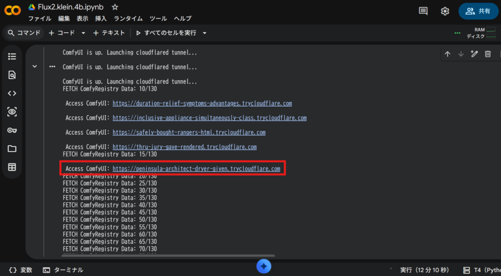 最後にComfyUIを起動するコマンドを実行します。Colabはクラウド上の環境なので、Cloudflareなどの「トンネル機能」を使って発行されたURL(リンク)をクリックすることで、あなたのブラウザにComfyUIの操作画面が表示されます!
