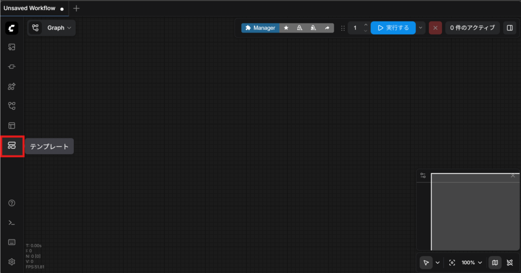 ゼロからワークフローを制作することもできますが、少し大変なので今回は既存のテンプレートを使用します。まず、画面左側の「テンプレート」をクリックします。