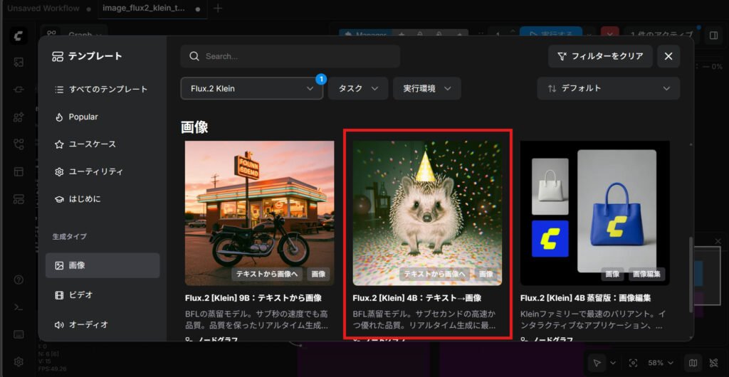 次に「画像」カテゴリーから、モデルフィルターを「Flux2.Klein」に設定して「Flux.2 [Klein] 4B:テキスト→画像」をクリックします。場合によっては「モデルが不足しています」と表示されますが基本的には「すべてダウンロード」をクリックして大丈夫です。