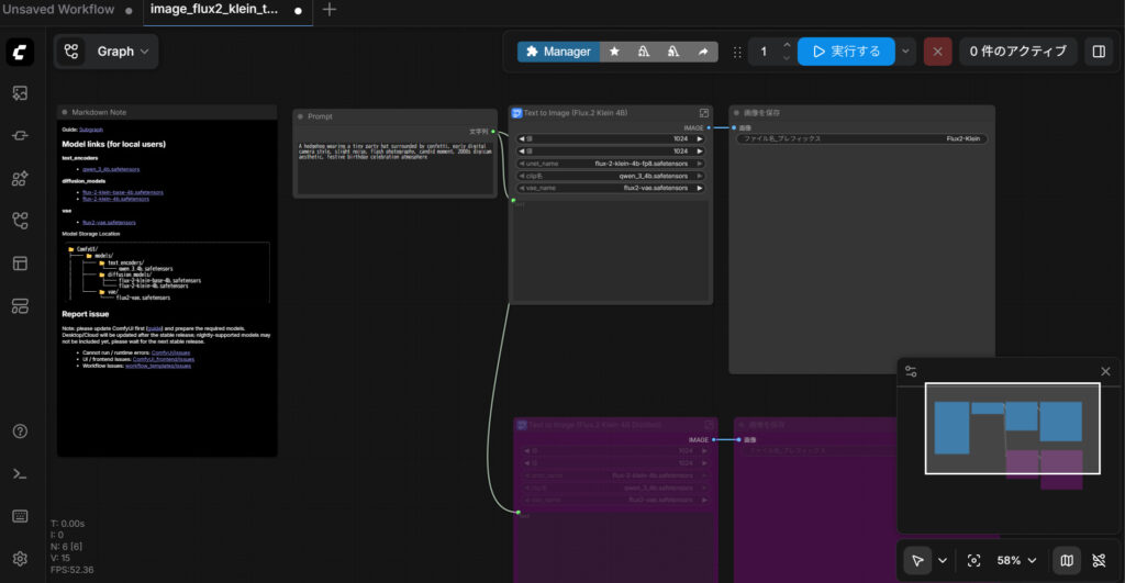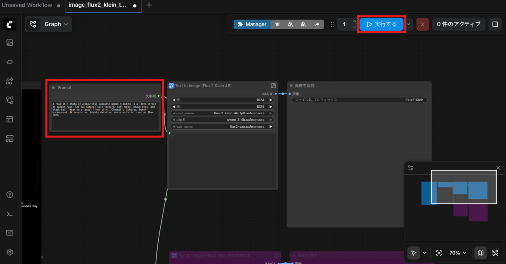 以上で最低限の設定はできたので実際に画像を生成してみます。「Prompt」ノードに以下のプロンプトを入力し、画面右上の「実行する」ボタンをクリックします。