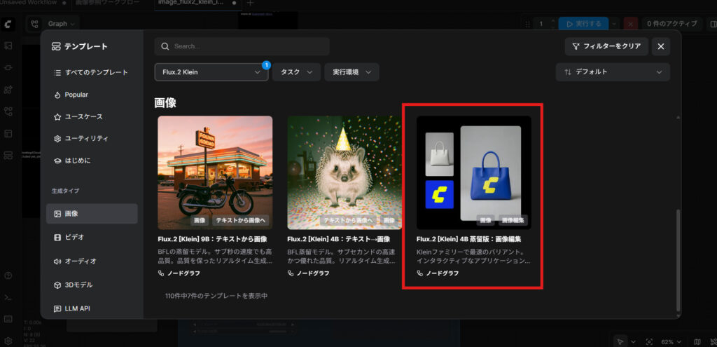 まずはComfyUI純正のFlux2.Klein4b用の画像編集ワークフローのテンプレートをだします。先ほどと同じく「テンプレート」からモデルをFlux2.Kleinに絞り「画像」から「Flux.2 [Klein] 4B:画像編集」を選択します。