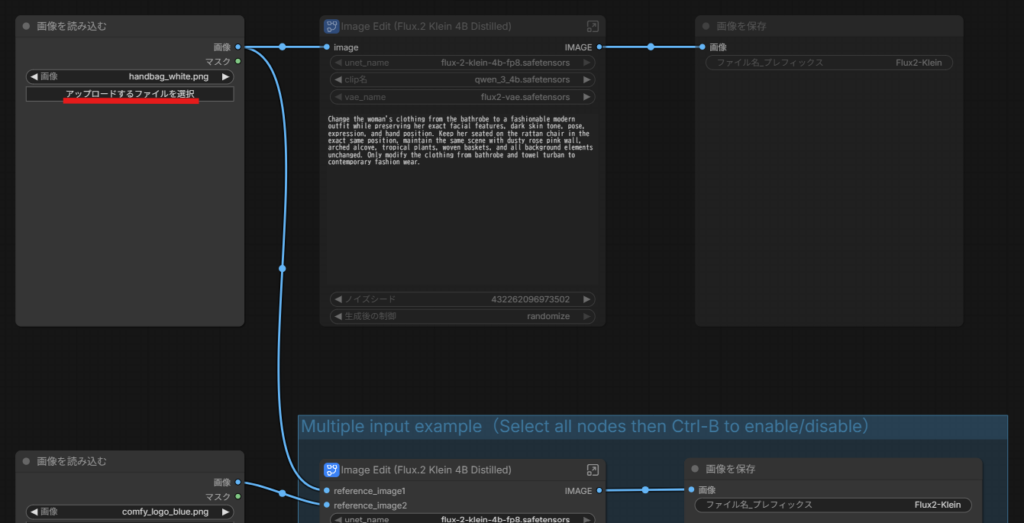 今回使わないノードはエラー防止のために無効化しておきます。ComfyUIでのノードの無効化・有効化はノードをクリックし「Ctrl+M」で可能です。今回は以下の2つのノードを無効化しておきます。