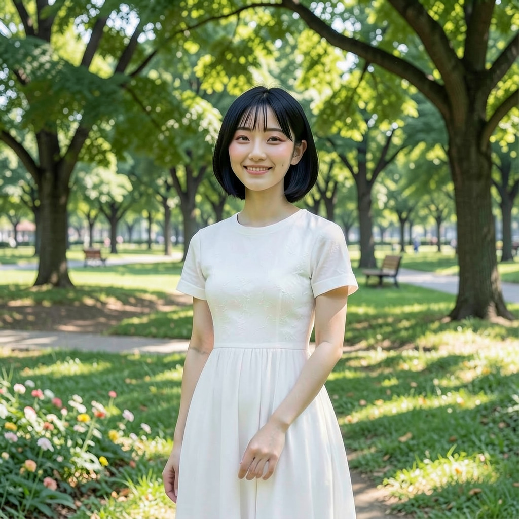a beautiful japanese woman standing in a park, wearing a white dress生成された画像は以下です。