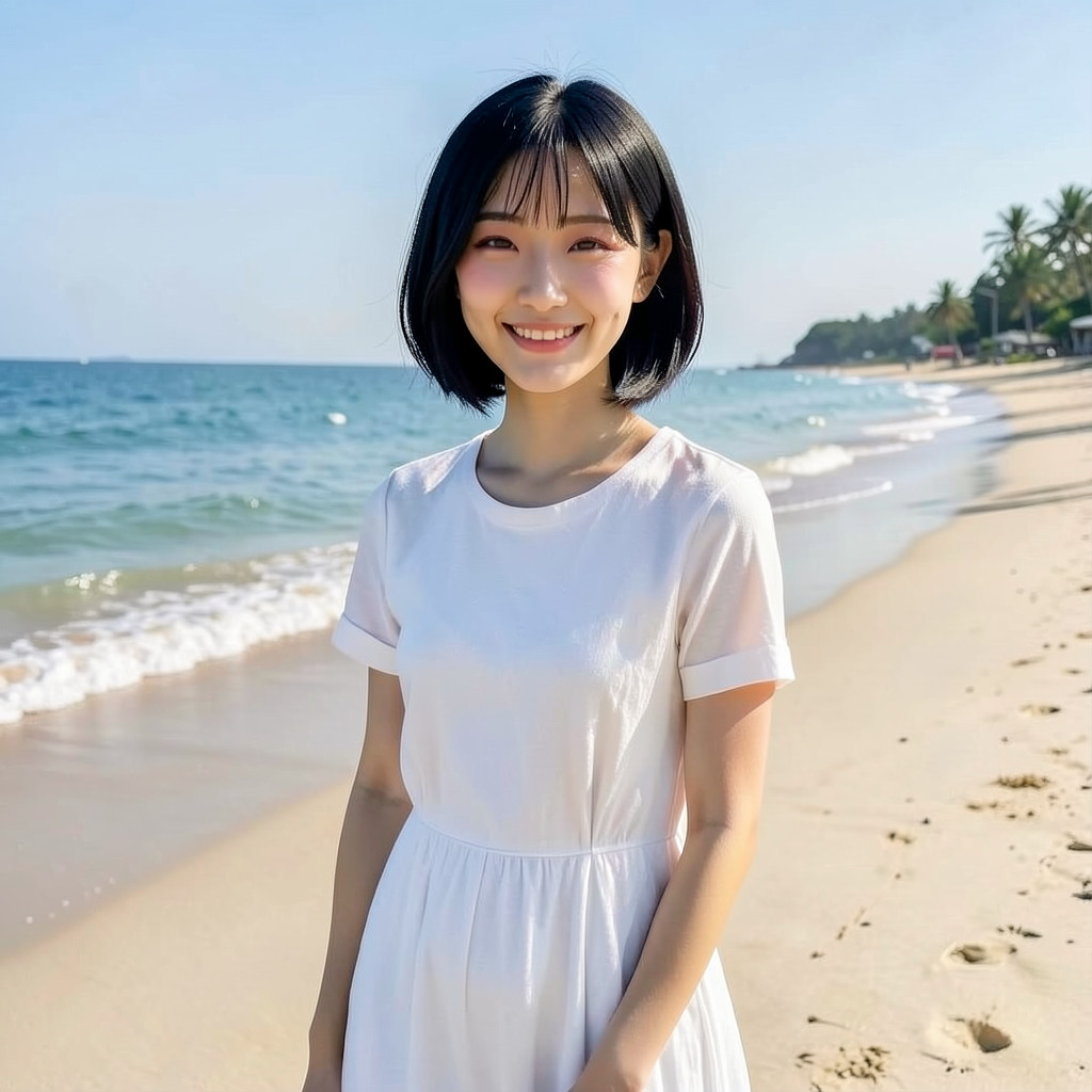 A beautiful Japanese woman in her twenties, wearing a white dress and smiling at the camera on the beach.Cinematic lighting, shot on 35mm lens, 8k resolution, highly detailed skin texture.