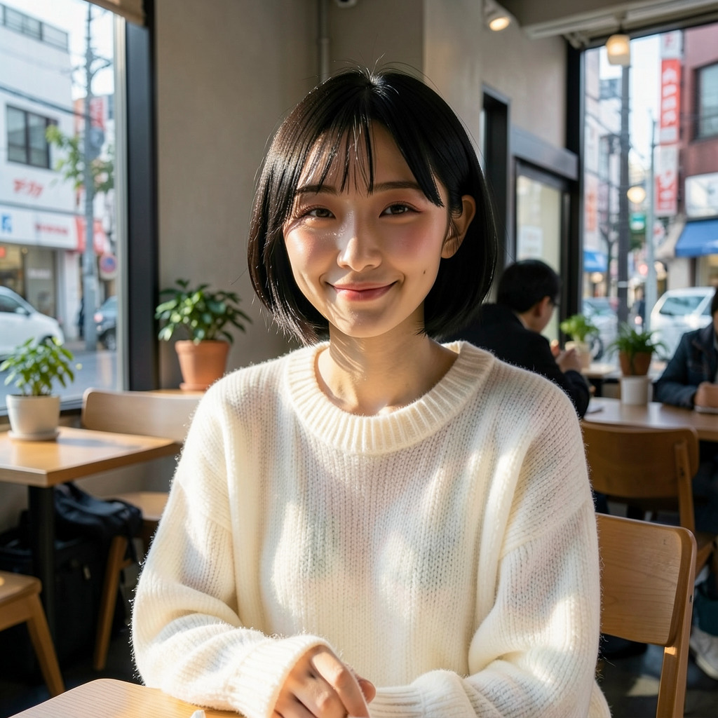 A hyper-realistic, Instagram-style portrait of a beautiful 22-year-old Japanese woman. She's wearing a trendy oversized white knit sweater, sitting in a modern Tokyo cafe bathed in sunlight, and smiling gently at the camera. Shot with cinematic lighting, a 35mm lens, 8K resolution, and incredibly detailed skin texture.