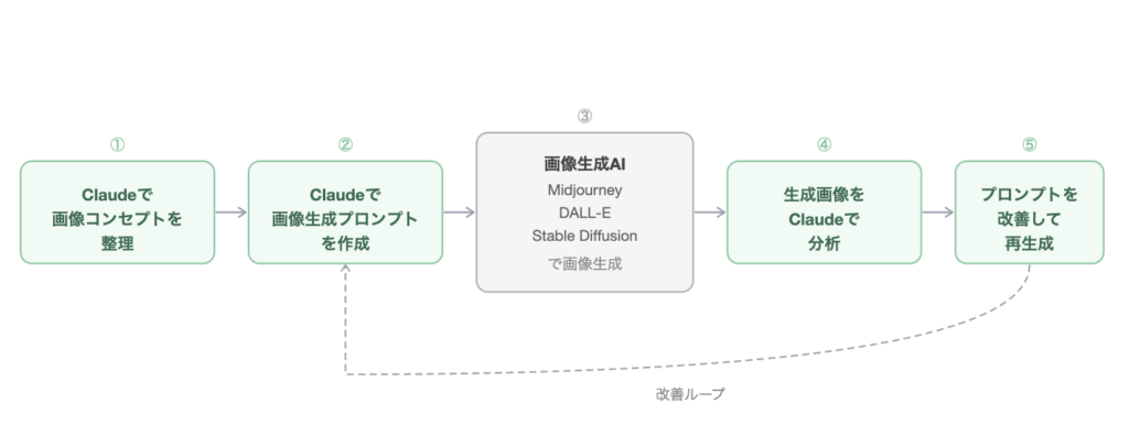 実際に、画像制作の現場では「Claudeでコンセプトを整理 → 画像生成AIで画像を作る」というワークフローを使うケースも増えています。