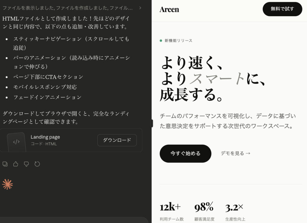 たとえば「シンプルなランディングページのデザイン案を作成してください」と依頼すると、ClaudeがHTMLやCSSを生成し、その内容をArtifacts上でそのまま表示してくれます。