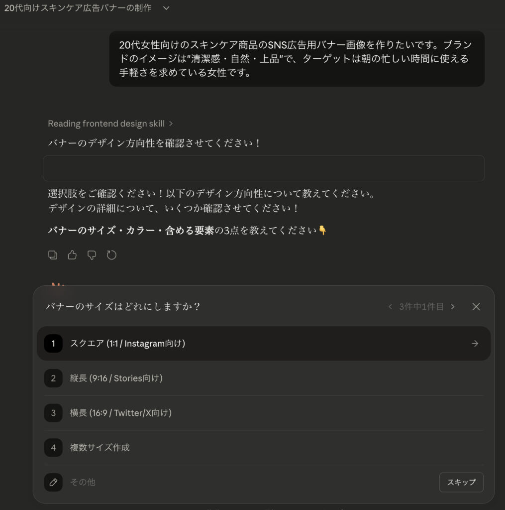 入力例: 「20代女性向けのスキンケア商品のSNS広告用バナー画像を作りたいです。ブランドのイメージは"清潔感・自然・上品"で、ターゲットは朝の忙しい時間に使える手軽さを求めている女性です。」