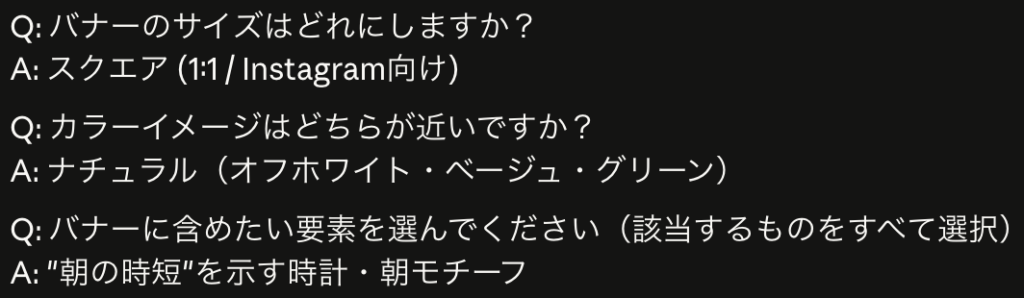 今回は、「バナーのサイズ」、「使いたいカラー」、「画像に含めたい要素」について聞いてくれました。