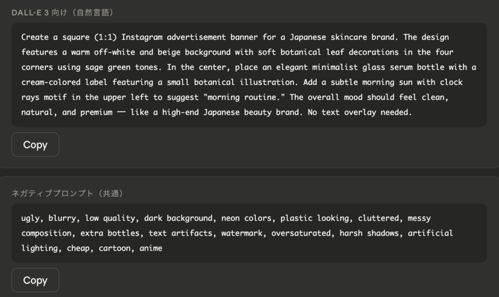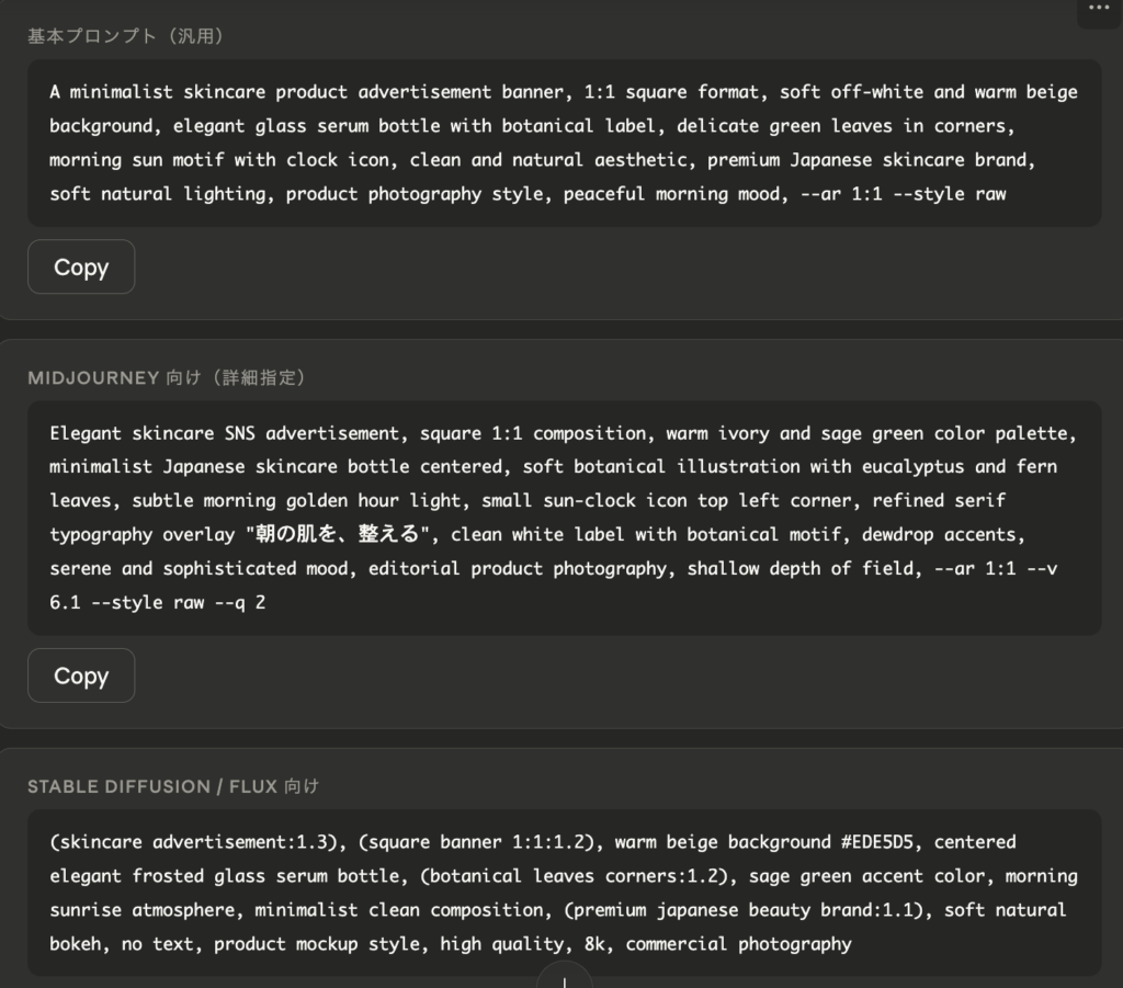 ツールごとの形式に整理してくれるため、そのままコピーして画像生成AIに入力しやすいので使いやすいです。