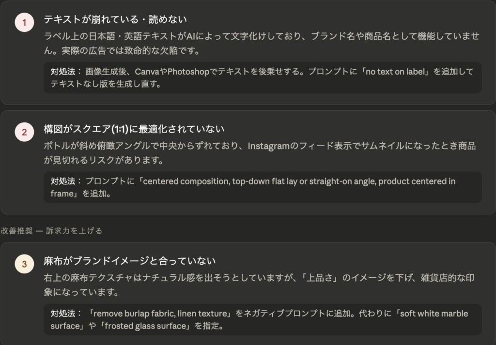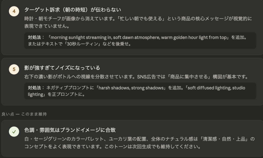 Claudeは、構図やテキストの可読性、ブランドイメージとの整合性など、複数の視点から画像を評価してくれます。