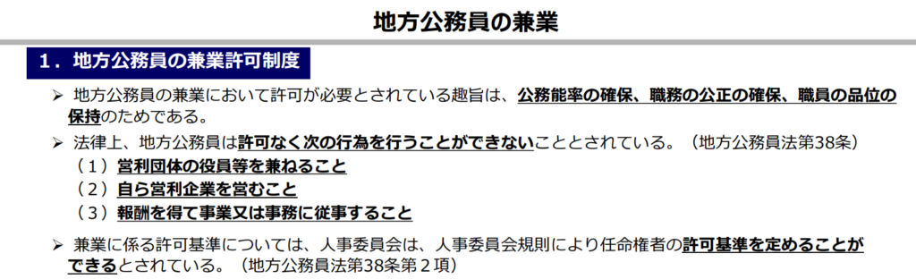 地方公務員の副業を考えるうえで、まず押さえたいのが地方公務員法第38条です。地方公務員は、任命権者の許可なしに、営利企業の役員を兼ねたり、報酬を得て事業や事務に従事したりできません。