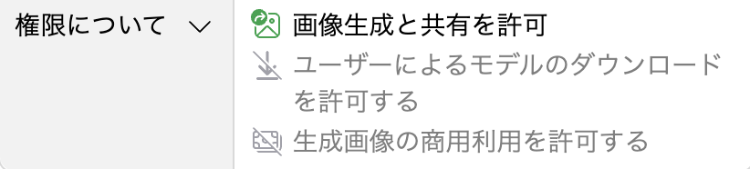 モデルもLoRAも共通して生成設定の一番下には必ず「権限について」記載されています。