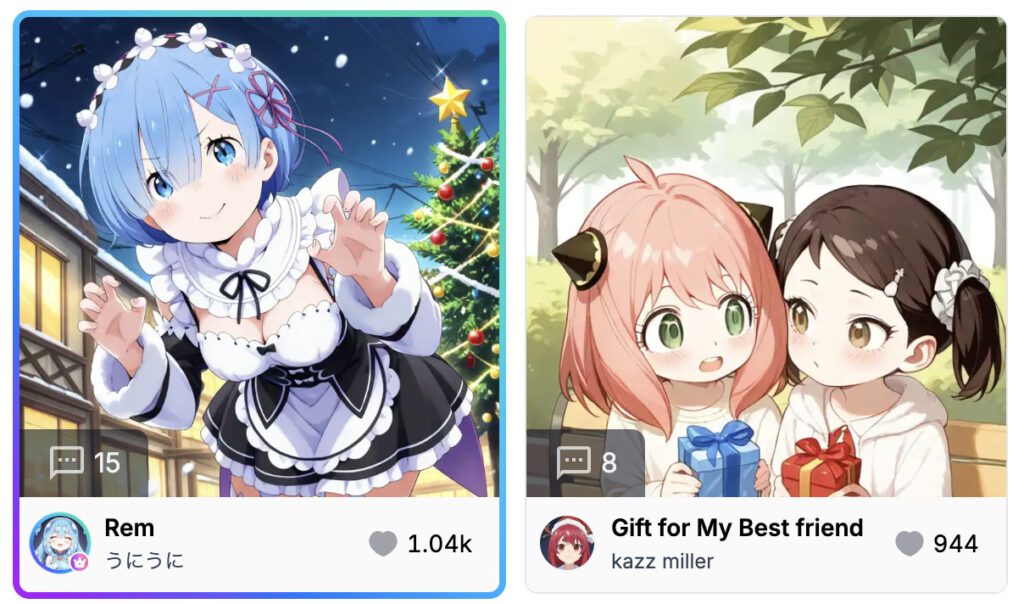 マーケット内では、他のユーザーが実際にそのモデルを使って生成したイラストを閲覧できます。