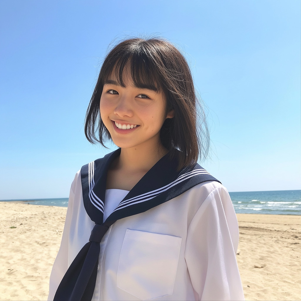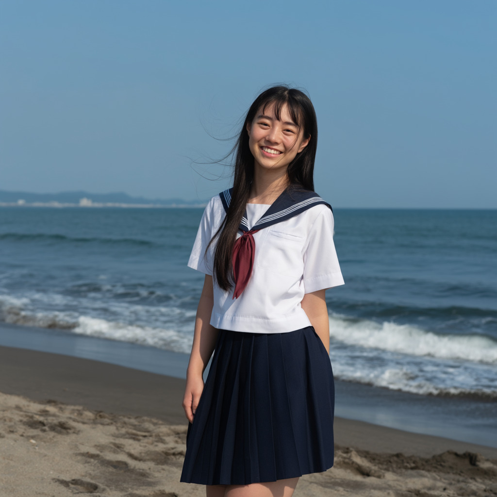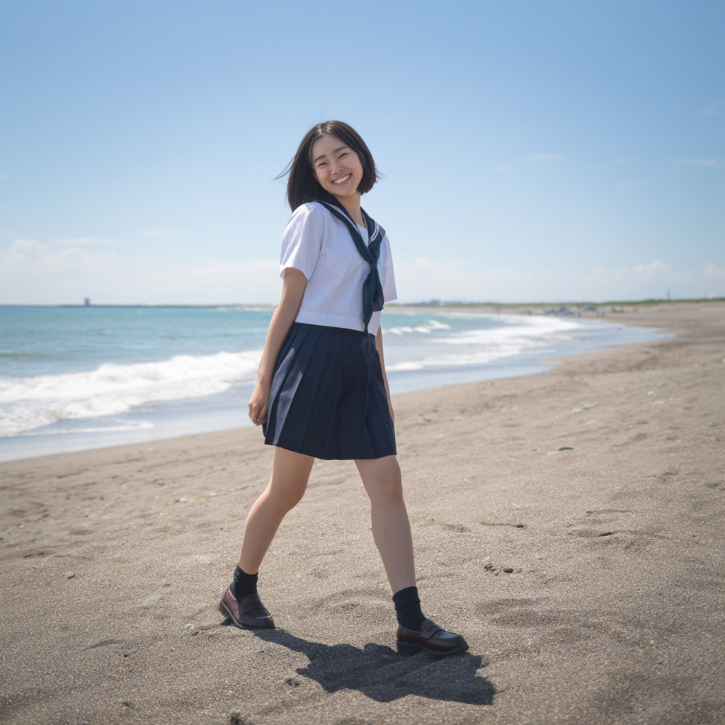 A portrait of an 18-year-old Japanese high school girl. She is walking on the beach in a sailor uniform, smiling. It's a bright, sunny summer day. The image is very realistic, like a photo taken with a smartphone.--raw