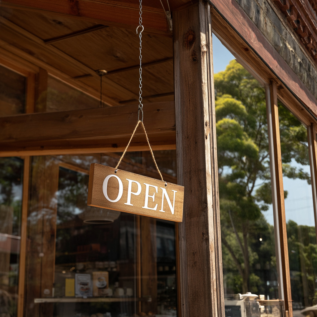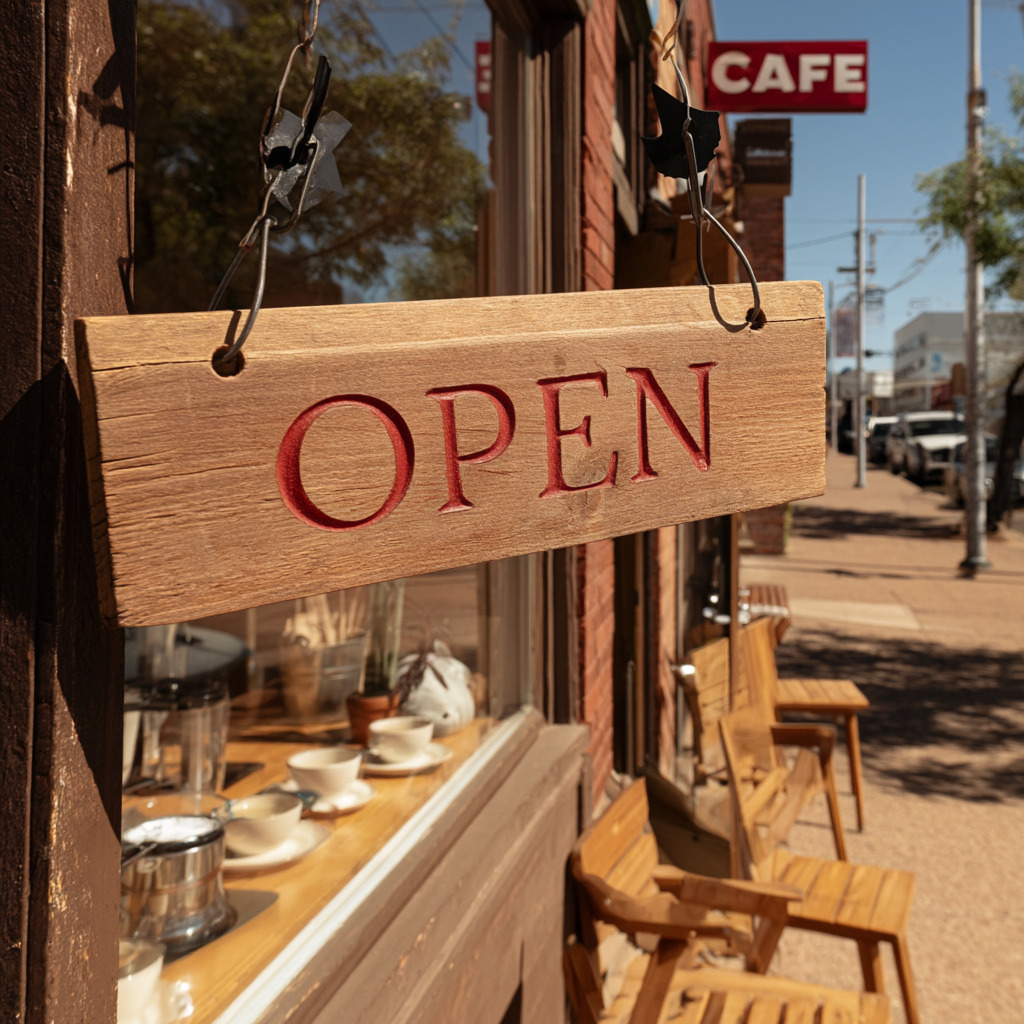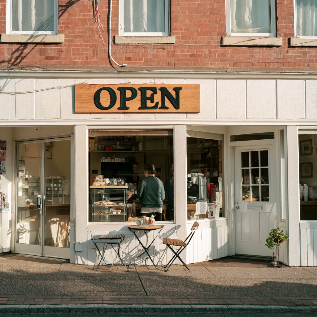 a cozy cafe storefront with a large wooden sign saying "OPEN", sunny morning, architectural photography
