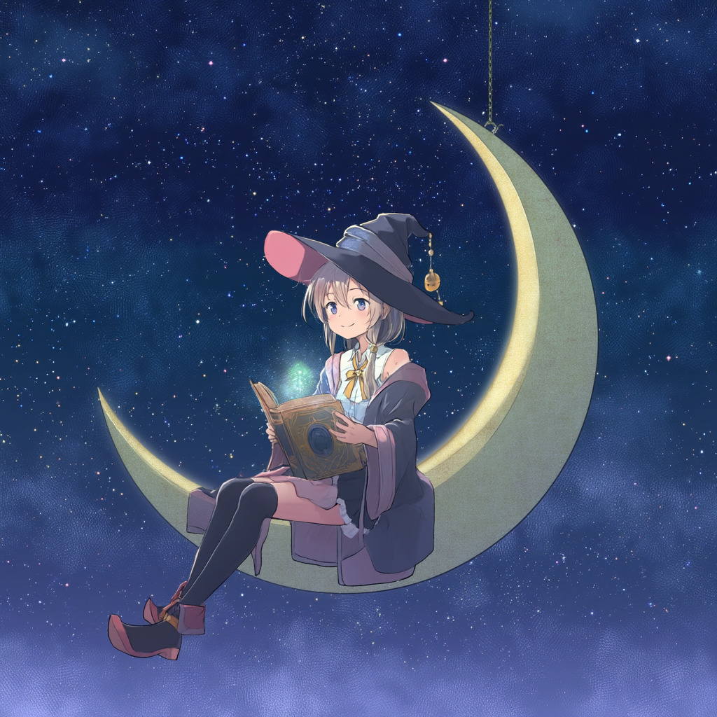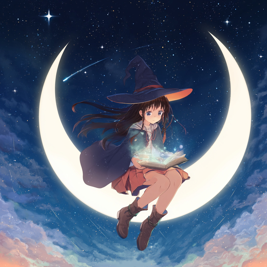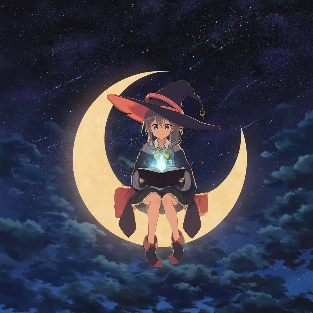 anime style illustration of a young witch reading a glowing magical book, sitting on a floating crescent moon, starry night sky background --niji