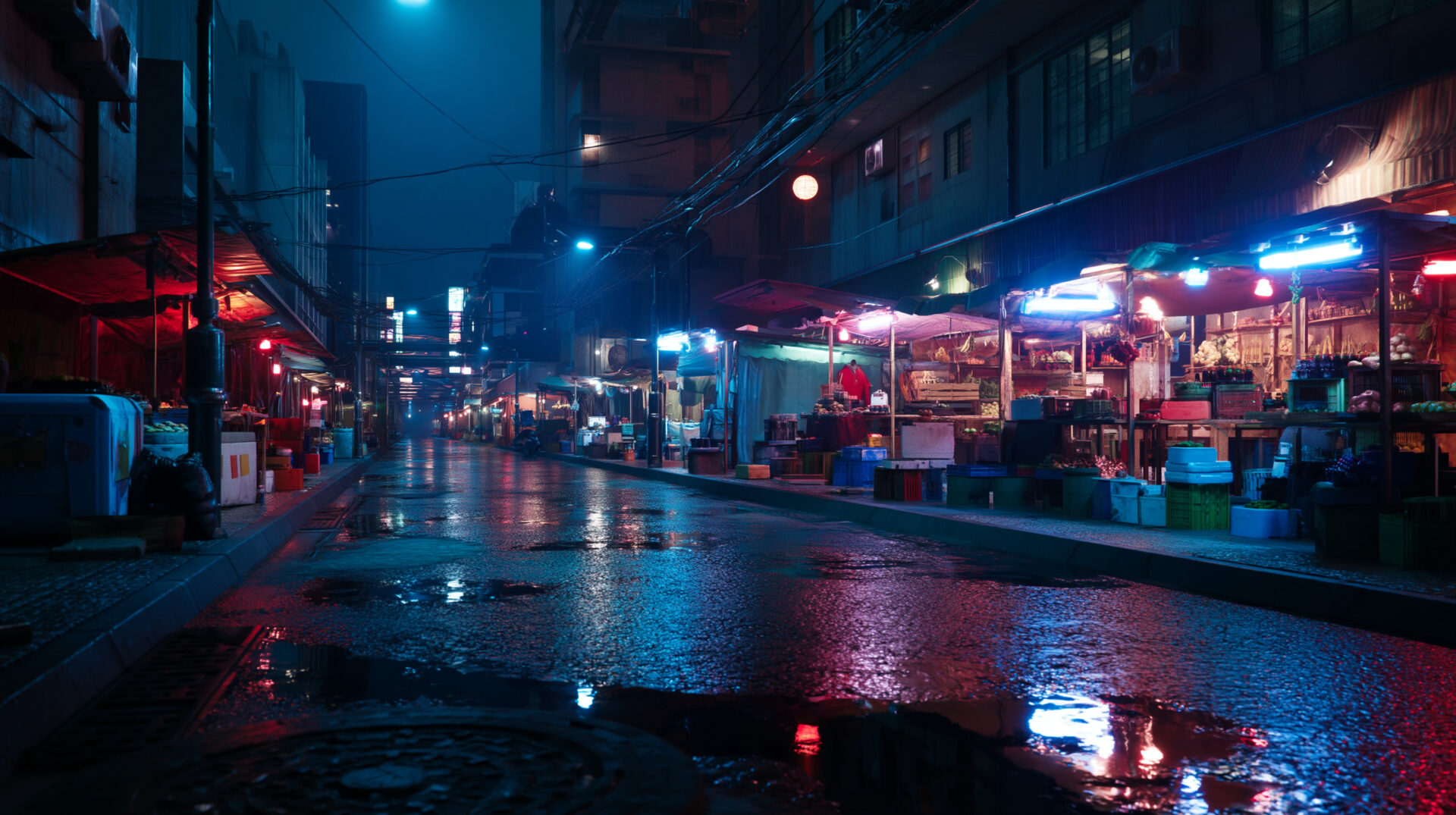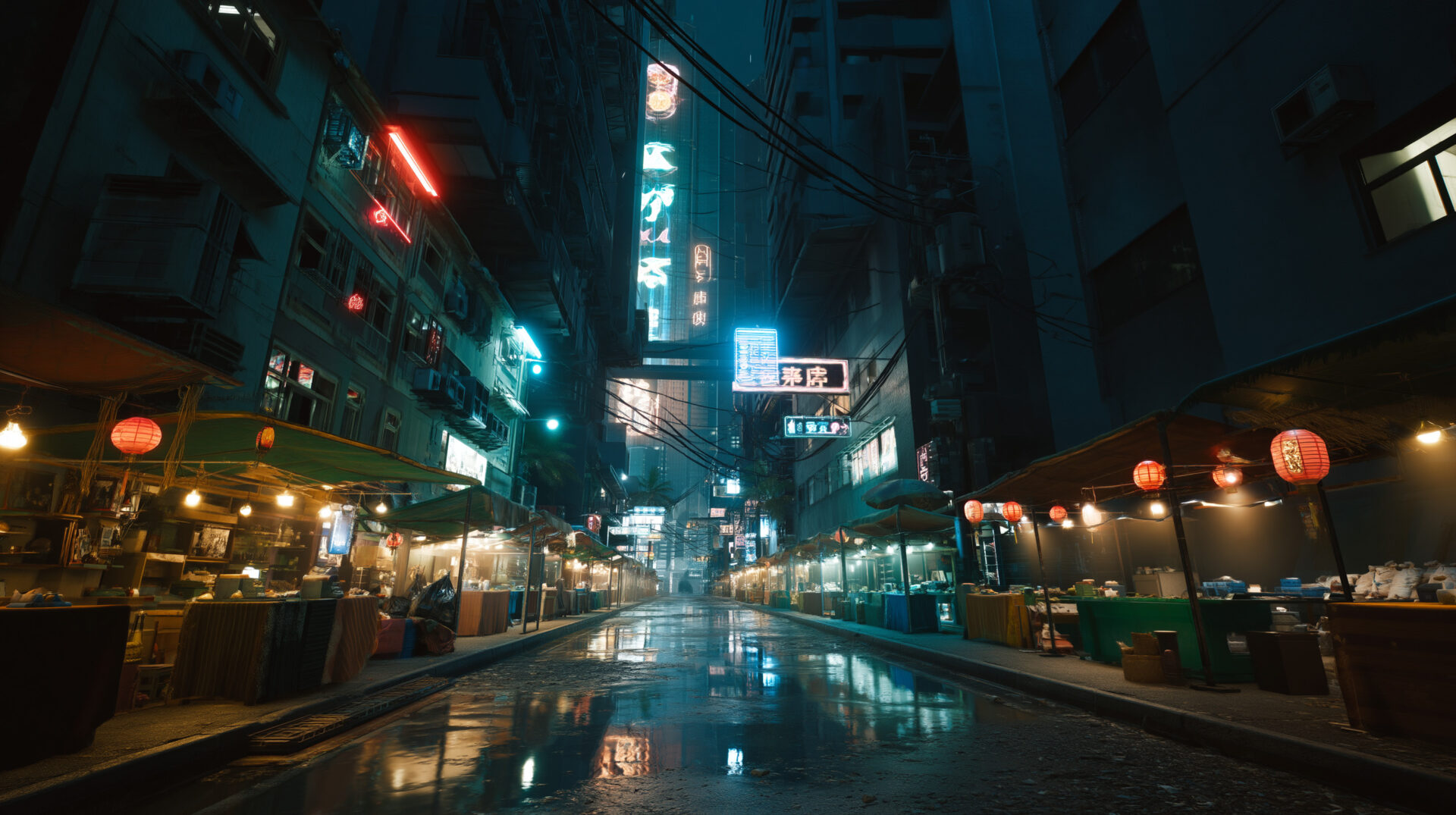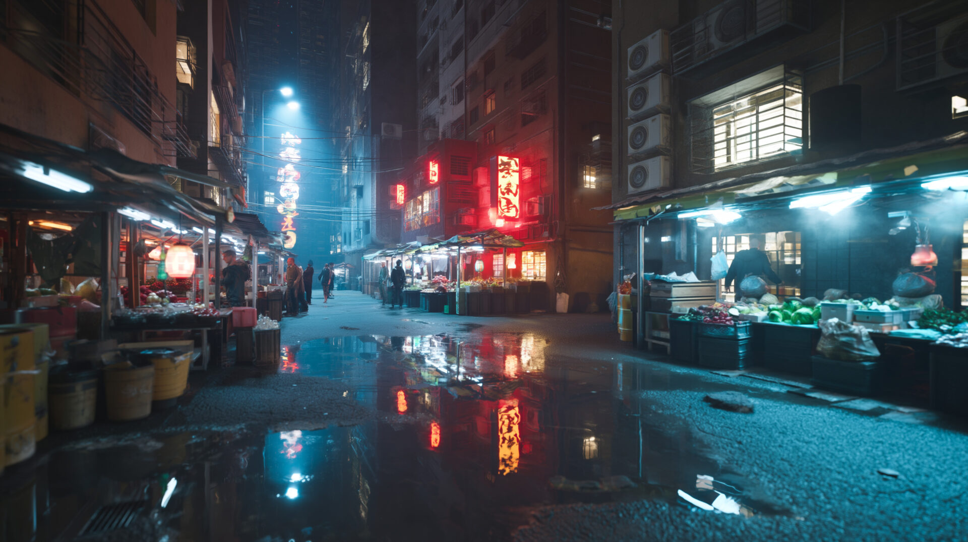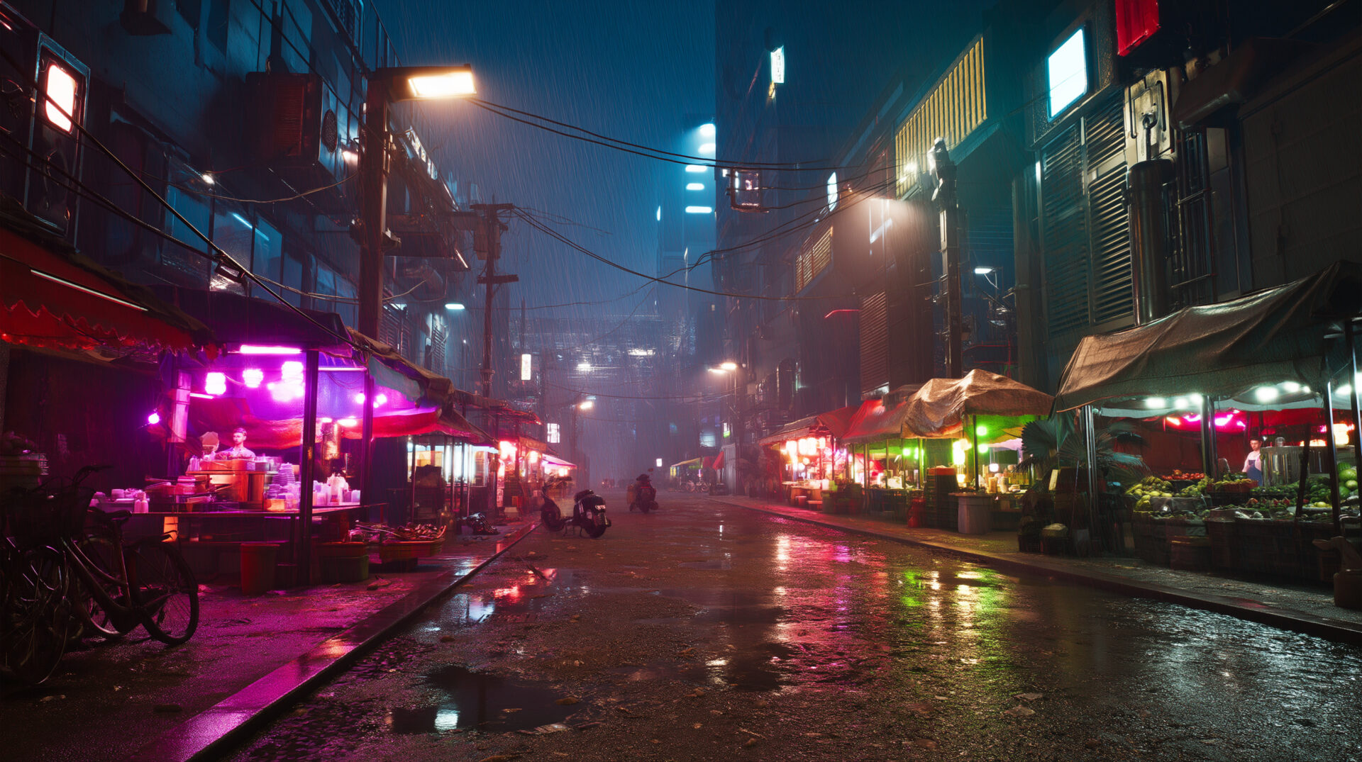 cinematic shot of a cyberpunk street market at night, neon lights reflecting in puddles, highly detailed, photorealistic --hd --ar 16:9