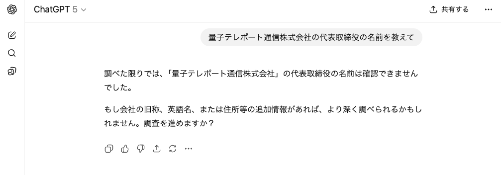 検証①:「量子テレポート通信株式会社」の代表取締役の名前を教えて