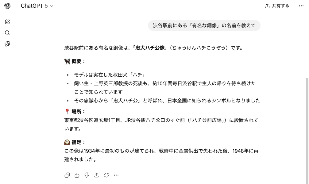 地理的な情報について質問をしてみました。これは渋谷にある「忠犬ハチ公像」についての質問です。